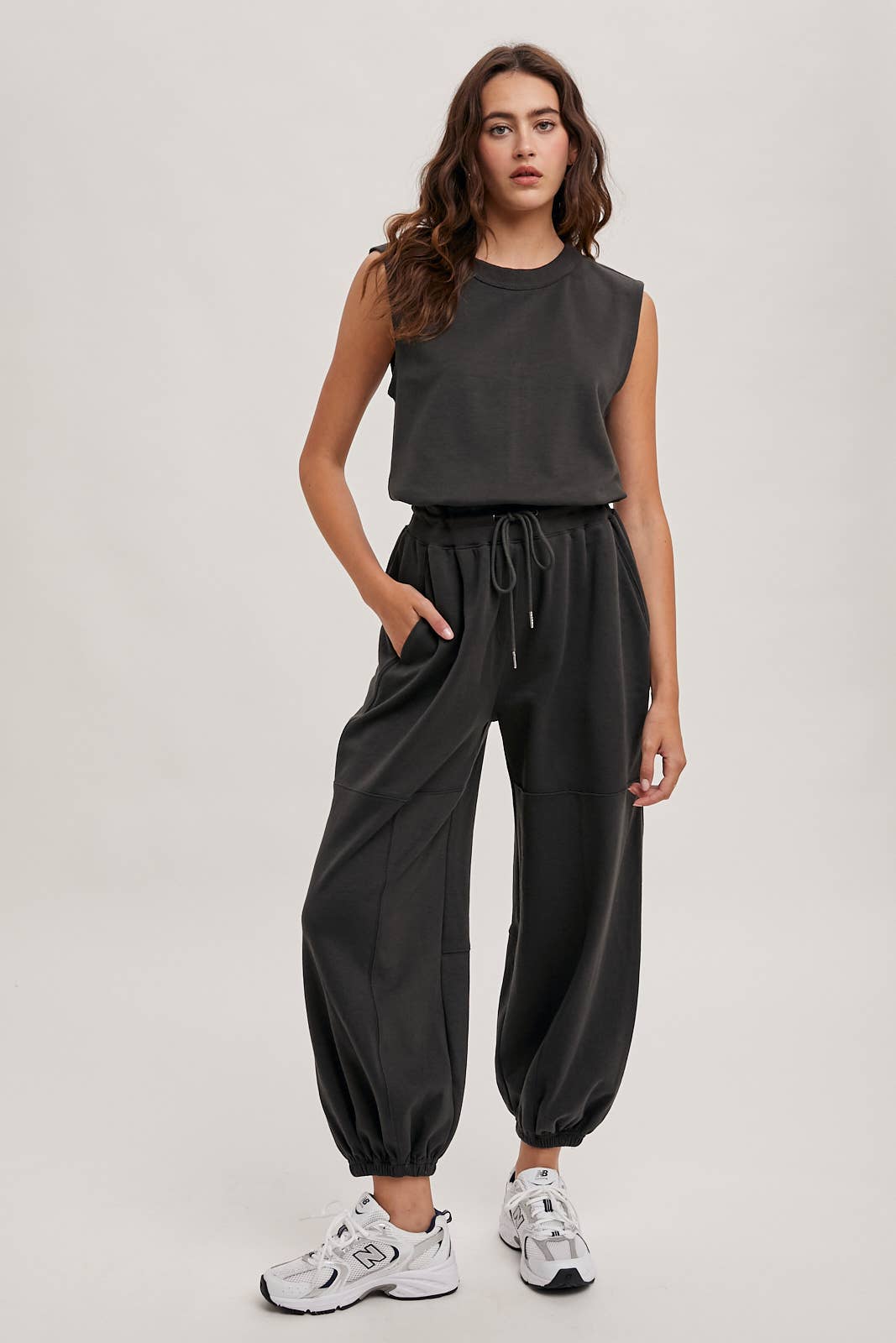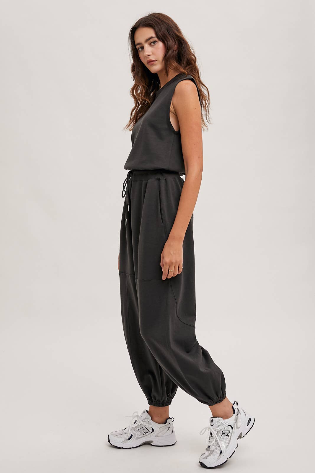 Drawstring waist sleeveless knit active jumpsuit. This comfortable and stylish jumpsuit is designed with a drawstring waist for an adjustable fit and features a sleeveless design that’s perfect for warmer weather or layering. Made from soft, breathable knit fabric, it’s ideal for casual outings, workouts, or lounging. The active jumpsuit offers a relaxed yet flattering silhouette, making it a versatile addition to your wardrobe.